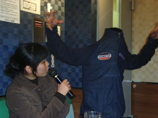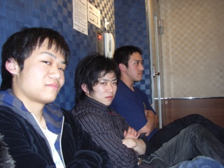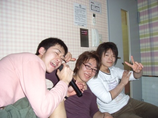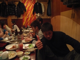 一次会の最後に三校でやらなかったエールの交換をし、完全に代替わりしました。 東大体操部の新しい幹部は以下のようになりました。 主将 小川和久 女子主将 松本真歩 主務 森本明 常務 西山枝里 今後とも東大体操部をよろしくお願いします。 そんな感じに一次会は終了。 二次会はいつものようにカラオケに行くことに。 みんなで移動し、カラオケの店での受付もすませ、いざ集金。 山本「帰る人は一人1500円、オールする人は一人2000円です。」 (・・・高い、さすが忘年会シーズン) みんな心の中でそう呟いたそのとき一人の漢(おとこ)が立ち上がった!! 大木「たけー、払えねーよ」 そう言い残し大木は逃走。 誰も彼を止めることはできませんでした。 ま、大木はさておき二次会の写真です。 |