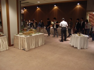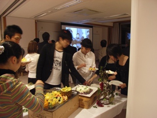 ケーキに群がる人々。今回は豪華な飯でした。 |
