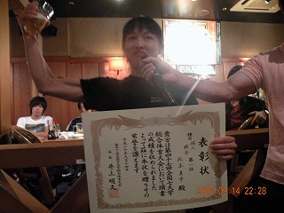 みんなにアルコールが回って来たころ 各賞の表彰がありました。 東大の番がきましたが・・・ ![]() 主将あいさつ 大木アルコールレベル「きてます」 ![]() 「おまえら!! そんなこと言って・・(自重)」 ![]() 「すいません、いいすぎました」 ![]() 鈴木アルコールレベル「ヤ〜バい」 「ええー、(自粛)」 男子がひと段落したところで女子の表彰です、 ![]() まっほいさんが四年連続個人総合優勝しました。 ![]() 「やりました!!」 賞状をアピール ![]() ついでに腕もアピール 視線を浴びてます。 |