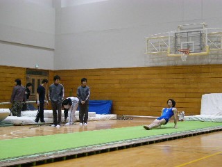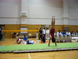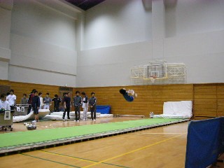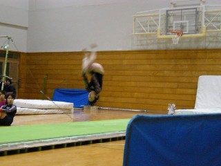 ![]() 榊原のバク宙。体育館は非常に暖かくてやりやすかったです。 |